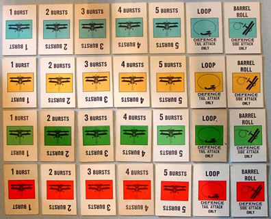 Because they appear to definitely be a part of a game, playing cards are rarely lost, but where are you going to go when you need one? Damaged cards seem to be much more prevalent, and that annoying bent corner on the Five Burst card will give you away every time. The shades and brightness of the colors varied with different ink lots at printing, so there is a wide variation from deck to deck. We have all playing cards in stock, and can quickly match almost any color and condition of wear so the replacement won’t stand out. Entire matched squadron decks are also available. High value cards can also be judiciously chosen and inserted to “stack” squadron decks…although we would never encourage such a thing…unless betting were involved. High wear cards are a paltry $1.00 each, moderate wear examples are $2.00, and low wear cards are $3.00. There is no charge for matching wear with existing cards, but a sample will be necessary.